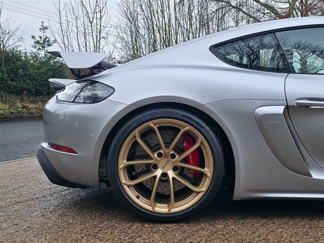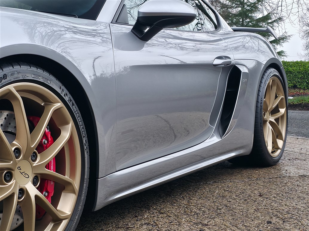 Additional Features: This 718 Cayman GT4 comes with extensive paint protection film (PPF), covering the front bumper, bonnet, front wings, headlights, mirrors, front roof section, door bottoms, side intake scoops, lower rear quarters, side skirts, rear bumper, rear lights, and even the door handles.