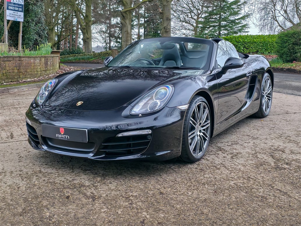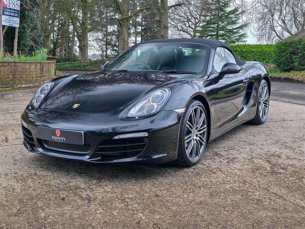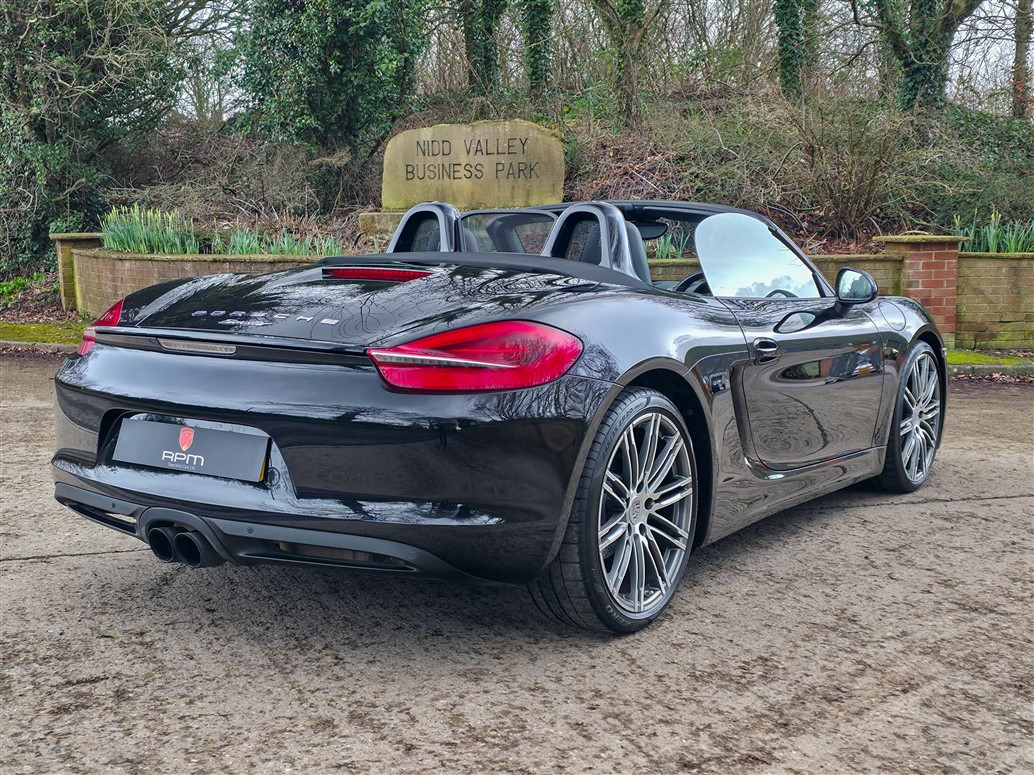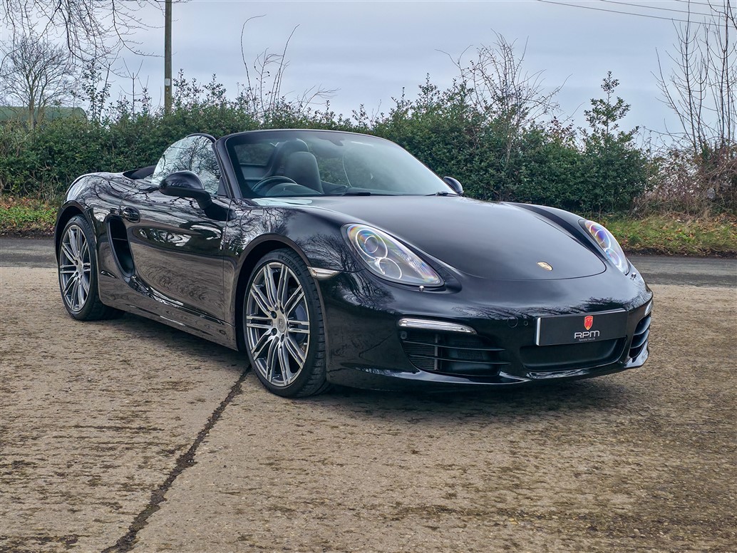 RPM Specialist Cars are delighted to present this 2015 Porsche 981 Boxster Black Edition for sale. Offered as a limited-production, high-specification model, the Black Edition stands apart from the standard Boxster with its black exterior accents, black model badging and a more comprehensive level of factory equipment. Bi-Xenon headlights, Porsche Communication Management (PCM), Sports Seats and upgraded alloy wheels were all specified as standard, resulting in a notably strong overall package.